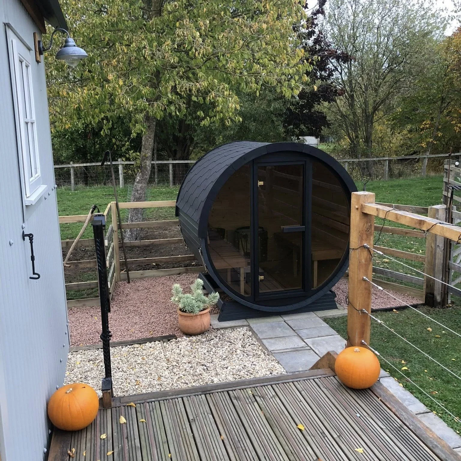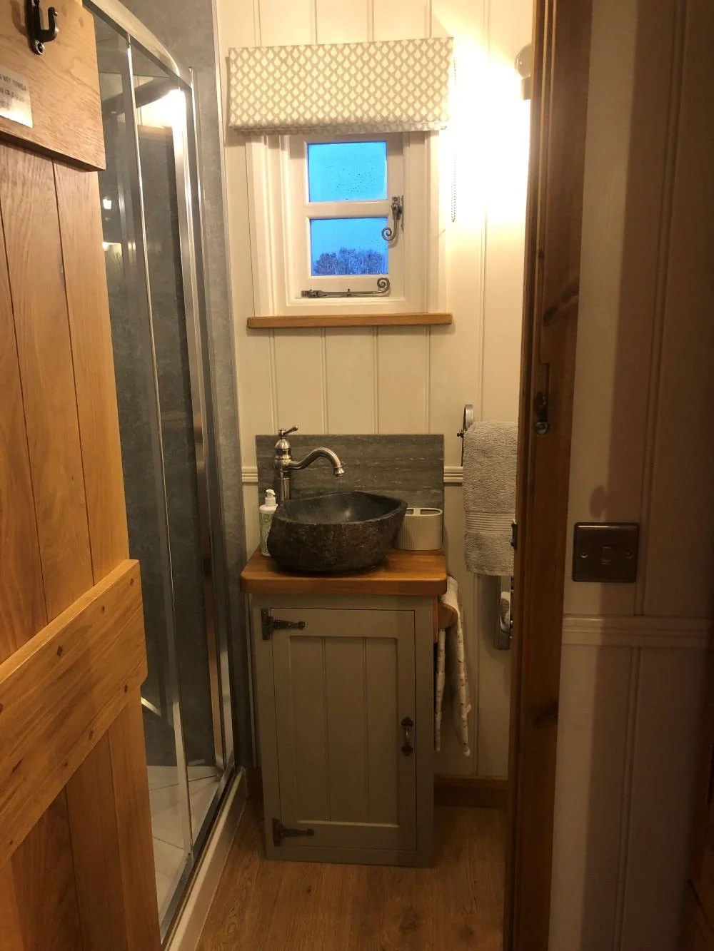 Inside, you’ll find an open-plan living space with a fully equipped kitchen, breakfast bar/work area, and a cosy lounge. Underfloor heating and a ground-source heat pump provide year-round comfort. The double bedroom and separate shower room with a powerful walk-in shower make the Cart Barn an ideal base for two.